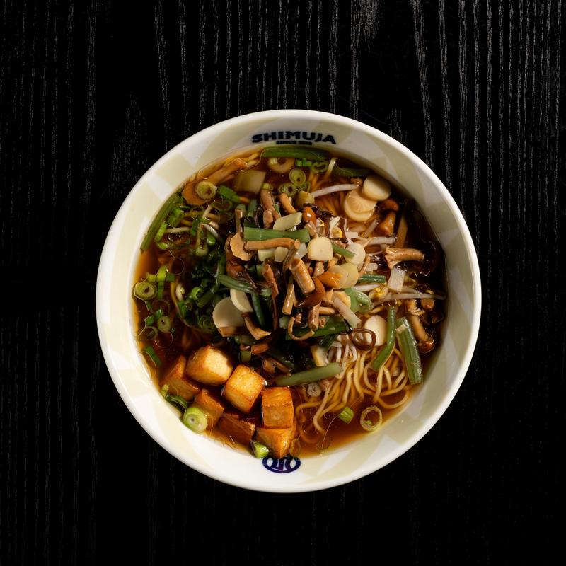 Natural Japanese Mountain Vegetables (sweet potato vines, bamboo shoots, flowering fern, wood ear, Nameko mushroom, stem lettuce), Fried Tofu, Bean Sprouts, Scallions, Thin Straight Noodles