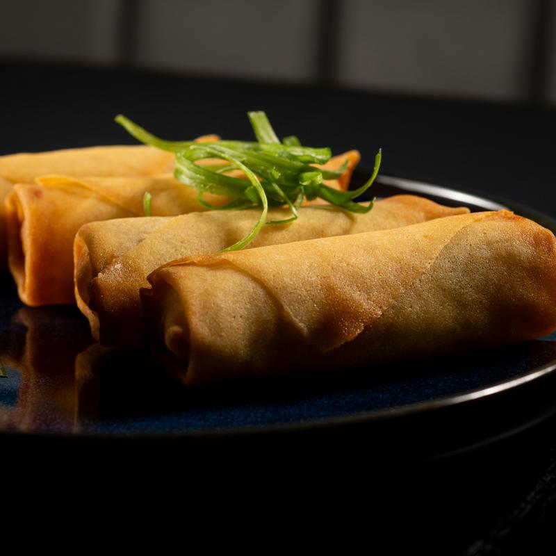 Egg wrap, cabbage, carrots, scallions, Bermenchini noodles, sesame oil, sweet chili sauce