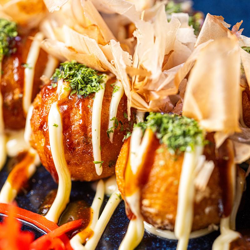 Octopus Japanese snack, Okonomi sauce, kewpie mayo, nori powder, bonito flakes