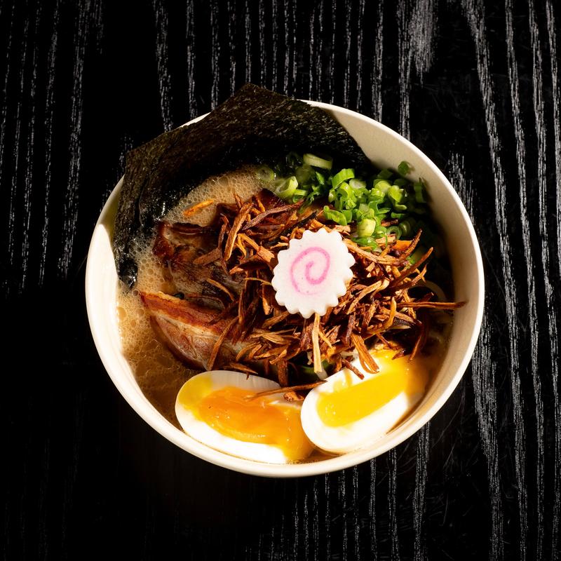 4 pcs Smoked Pork Belly, Fried Burdock, Naruto, Scallions, Menma, Whole Egg, Garlic Chips, Thick Wavy Noodles, (4 oz Pork Tonkotsu Broth)